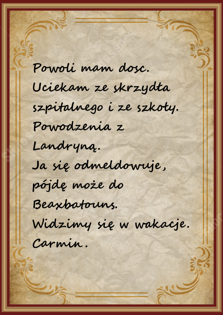 Gracze dostają list od Carmina, w którym ten pisze, że ma dość wszystkiego i postanawia uciec do Beauxbatons. Wszystkim jest z tego powodu trochę przykro, nawet Fengari.