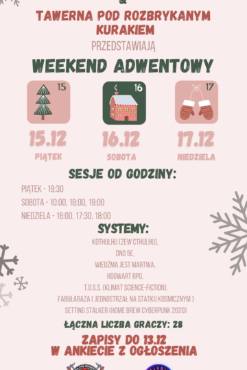 Ho, ho, ho! Grudzień dopiero w połowie, a my po serii fantastycznych sesji Mikołajkowych przybywamy do was z kolejnym eventem! W kolaboracji z Tawerną pod Rozbrykanym Kurakiem mamy wam do zaoferowania Weekend Adwentowy! To specjalne wydarzenie, polegające na tym, że nie wiesz tak naprawdę na jaką sesję się zapisujesz. To zupełnie tak jak przy otwieraniu […]