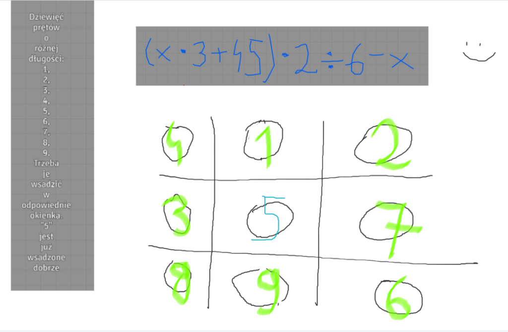 Ostatnie pomieszczenie. Są dwa drzwi: jedne małe z napisem „wyjście” i drugie większe wrota z napisem „dodatkowe rzeczy, zagadka”. Oczywiście drużyna wybiera drugie drzwi. W pomieszczeniu są kolejne drzwi z otworami tworzącymi 3 kolumny i 3 wiersze. Są pręty o różnych długościach od: 1 metra do 9 metrów (czyli 1, 2, 3, 4, 5, 6, 7, 8, 9). W 2 kolumnie i 2 wierszu jest już włożony pręt o długości 5 metrów, jest napisana informacja, że jest on w poprawnym miejscu. Jest też podane jakieś równanie do rozwiązania.